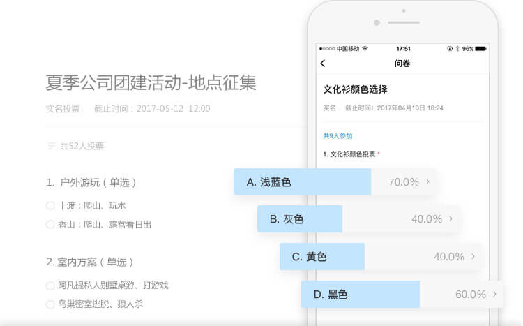 支持投票、考核两种问卷形式;投票问卷,可定制投票活动内容,轻松动员投票;考核测试,多种字段类型自定义问卷内容,系统自动计算分数,结果占比清晰了解,也可导出报表,线上问卷如此便捷、高效。