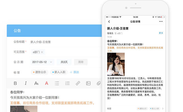 新人入职、企业重要消息、通知随时通告,内容支持富文本编辑,发布后工作台置顶,公示期自由设置,回执功能让传达情况一目了然。