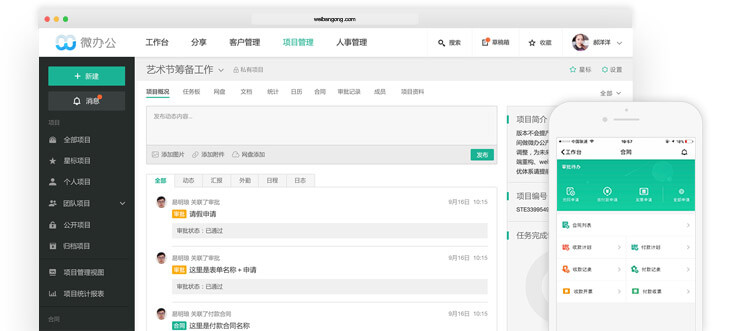 可创建私有/团队项目,按任务板拆分任务、子任务,项目日历、统计视图,随时查看项目进程、动态;复制功能让规范化项目直接复用。收/付款两种合同类型,实现项目合同的全流程管理。