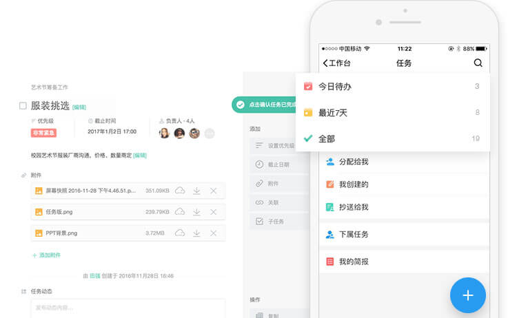 按需分配工作,内容清晰明确,多层次任务分解,紧急任务重点提醒,保证工作的有序进行,从任务下达、跟踪、协作到归档,完整记录。