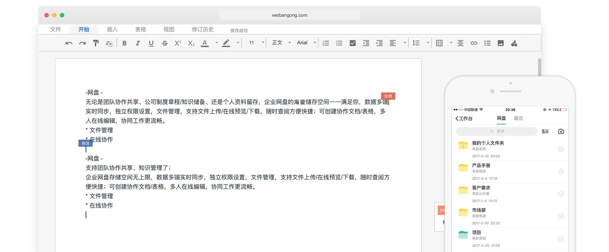 企业网盘海量储存空间,多端数据实时同步,文件管理支持文件上传/在线预览/下载,灵活的权限设置,随时查阅方便快捷;可创建协作文档/表格,协同工作更流畅。