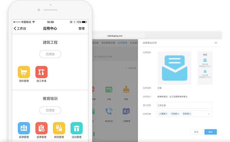 自主设置应用的展示名称/应用范围;支持添加第三方应用,滴滴/微信/携程等辅助办公应用,快速跳转;行业套件,提供快销/生产制造/建筑工程/教育培训等4个行业的管理应用套件,垂直行业贴合企业实际业务场景。