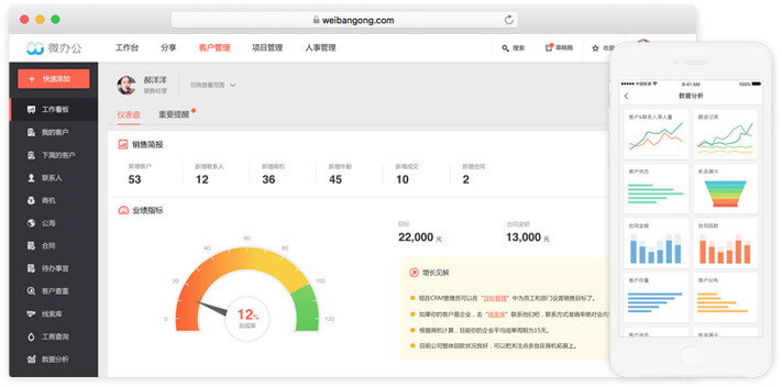 工作看板,直观了解下属的业绩指标、销售简报,多维度视图展示数据分析和绩效排行,时刻掌握客户状态、销售业绩;公海,帮助企业锁住客户资源、沉淀企业资本;透客,帮助销售把握销售契机,使企业销售业绩快速达成。