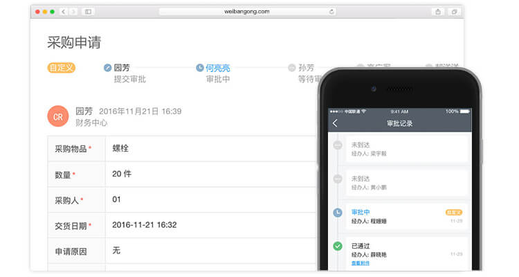 传统的采购流程,从挑选采购物资到确定后报告领导等待领导通过并去财务领取资金或垫付后报销到采购,经过人员多环节复杂,拖压时间物资到位慢,效率低。微办公的审批可以轻松化解难题,自定义审批表单内容,根据公司业务场景,创建采购单、报销申请表,设置审批处理人,申请人客户端随时发起、管理人轻松处理审批,便捷高效,又有记录沉淀,不用再因一个环节的处理怠慢而止步不前了。